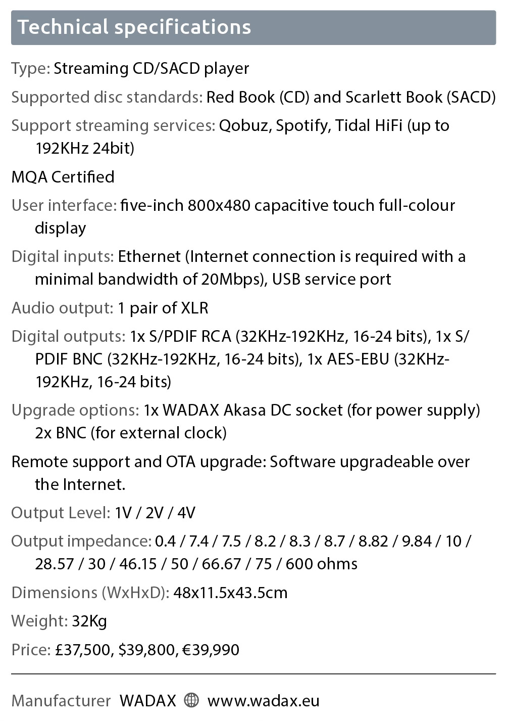 That could sound like a deal-breaker, but those who like what the WADAX Studio Player does will brush it off as a triviality. For good reason, its sound is both distinctive and good enough to grant WADAX admission to digital’s top table. For those who still have and love their CD and SACD collection, and love their access to streaming services, the WADAX Studio Player is the one to watch.